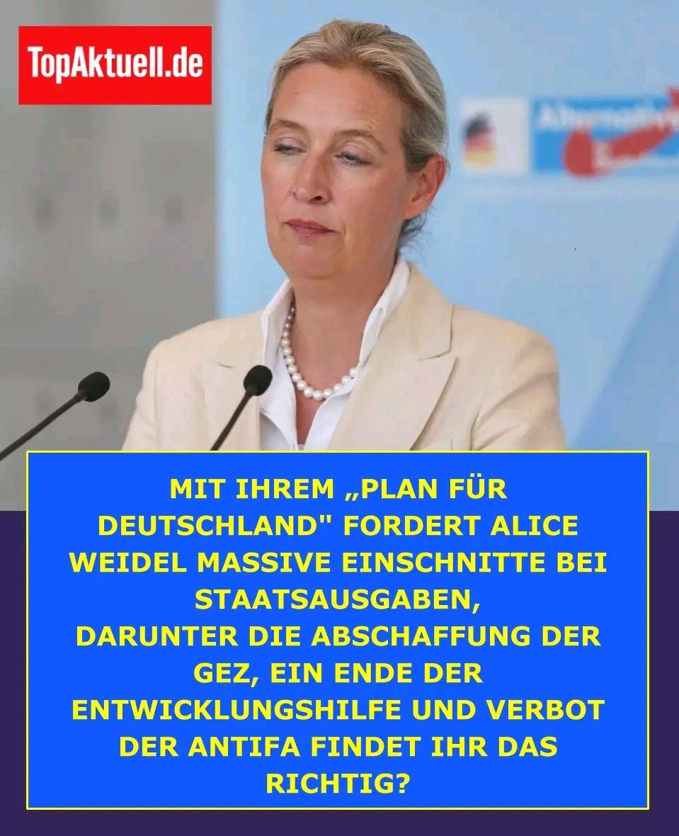 AfD-Fraktionschefin Alice Weidel hat im Bundestag ihren sogenannten „Plan für Deutschland“ vorgestellt. Dabei kündigte sie mehrere weitreichende Maßnahmen an und forderte ein Ende aus ihrer Sicht unnötiger Staatsausgaben. Unter anderem will sie die Rundfunkgebühren abschaffen, staatliche Fördermittel für politische Organisationen streichen und die staatliche Entwicklungshilfe beenden. Besonders umstritten ist ihre Forderung, die Antifa als Terrororganisation einzustufen. Die Vorschläge lösten im politischen Raum starke Reaktionen und hitzige Debatten aus.